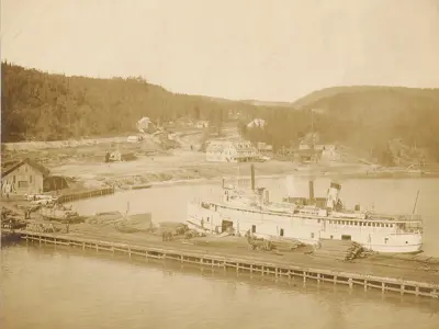 The imposing cliffs and impenetrable shoreline of Old Woman Bay claimed the wreck of the GOLSPIE on December 4, 1906. This 200 foot wooden steamer belonging to the MacKay Company of Sault Ste. Marie was down bound from Fort William with a load of supplies for the CPR when it became unresponsive during a fierce snow storm. The ship and its crew of 18 drifted approximately 60 miles/100 kms north from 25 miles off Whitefish Point to where it beached itself near the mouth of the Old Woman River. Captain Boult managed to get everyone safely to shore only to find that they had very few provisions. He sent 12 of the crew in a yawl boat to Michipicoten River where they could get supplies and send word to the ship's owners. Ill prepared for the fierce head wind and bone-chilling temperatures, the wet and weary crew abandoned the small boat and decided to walk along the coast to Michipicoten instead. The journey was no easy task. Local boarding house owner Joe Legarde and his guests welcomed 3 of the crew that arrived at his doors in Michipicoten River Village in the middle of the night. The next morning, William Kimball, John Andre, Alex and Joseph Michaud manoeuvred a rescue boat out through the treacherous Michipicoten River mouth and scoured the shoreline for the remainder of the crew. Four miles from the village the rescuers came across the half frozen men, one walking in his stocking feet. The villagers spent the next day trying to warm the frozen hands and feet of the motley group. Joe Legarde's dog team took the worst of the crew to the Algoma Central Railway in Michipicoten Harbour where they were transported to the hospital at the Helen Mine, then by boat to the Plummer Hospital in Sault Ste. Marie. One worker died from pneumonia, two had their feet amputated, and one had both his feet and his hands amputated.