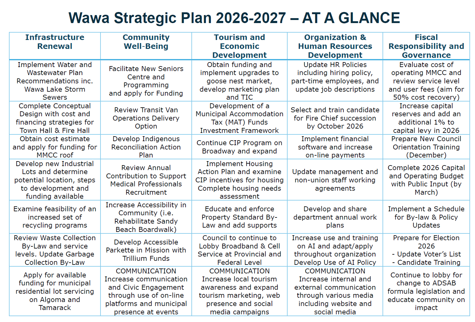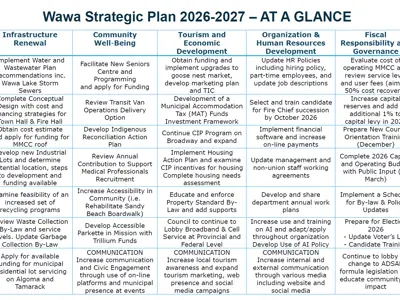 Residents are encouraged to review the Strategic Plan and learn more about the goals and actions that will help shape Wawa’s future. Community awareness and engagement play an important role in ensuring the plan reflects the needs and aspirations of our residents.